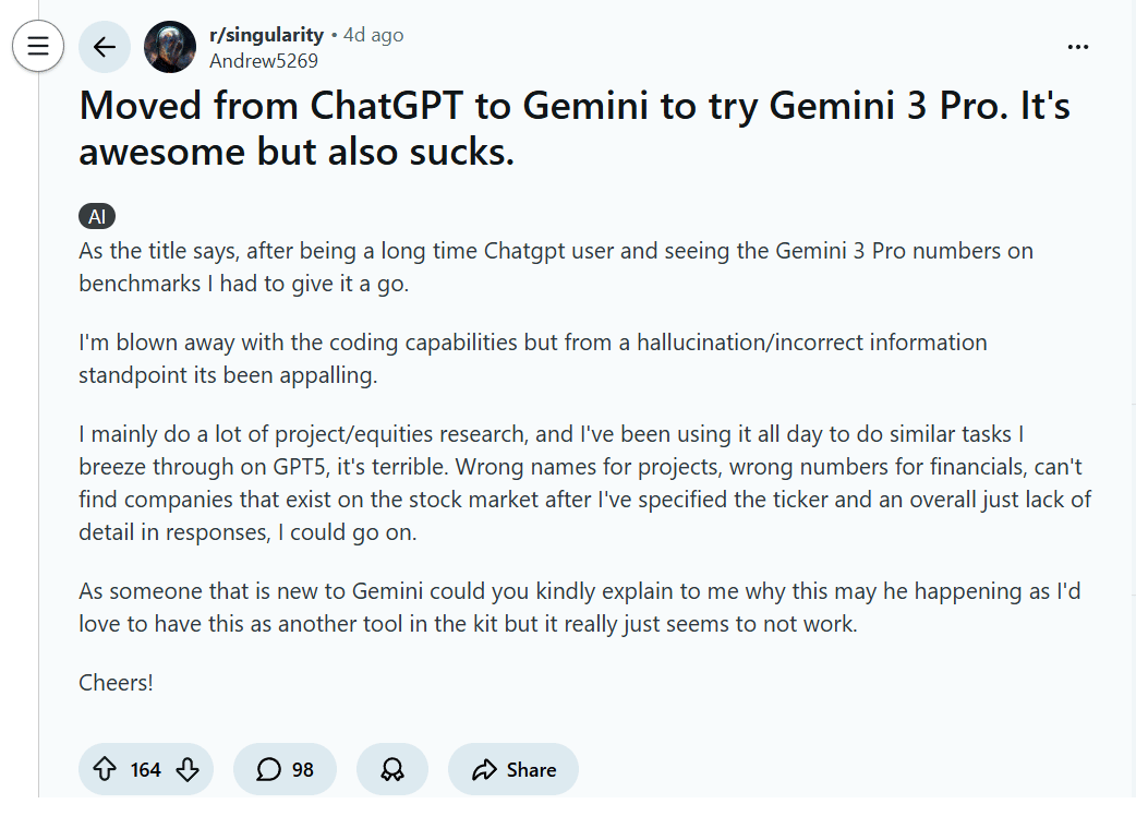 What this means: Gemini 3 Pro is AMAZING for creative work, brainstorming, and coding. But for fact-checking and specific data? Always verify.